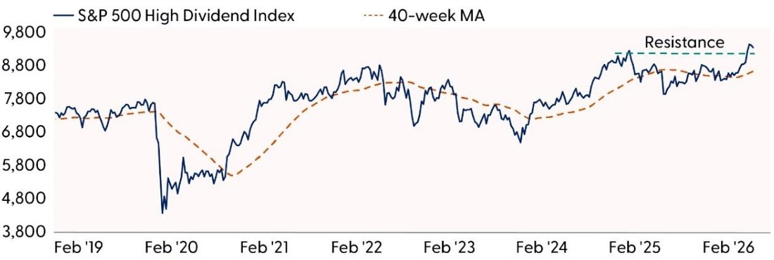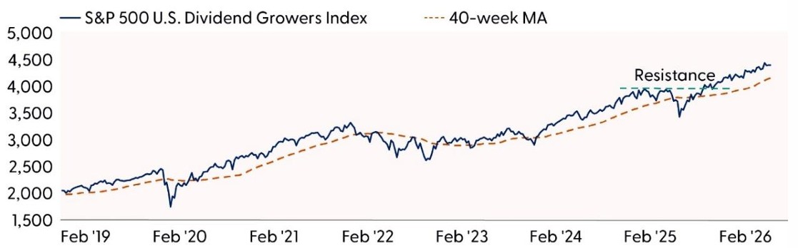 • S&P 500 U.S. Dividend Growers Index (dividend growth): The index has climbed steadily above a consistent uptrend that has been in place since April 2025. Realized volatility has been exceptionally low, with the index registering a maximum drawdown over this period of only around 3%. Momentum indicators remain bullish, but not overbought, and point to further upside potential. On a relative basis, the S&P 500 U.S. Dividend Growers Index has broken out of a bottom versus the S&P 500, pointing to further runway for outperformance.