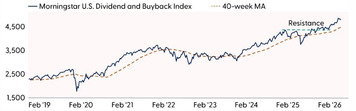 • Morningstar U.S. Dividend and Buyback Index (shareholder yield): The index has continued to set new record highs after breaking out from a year-long base last fall. Recent overbought conditions have normalized as prices pulled back to test uptrend support. Participation has been robust, with 75% of constituents now trading above their 200-day moving average, a 25% improvement since November. Based on the prior consolidation range, a minimum technical upside objective sets up near 5,400, implying roughly 12% of potential upside from current levels. On a relative basis, the Morningstar U.S. Dividend and Buyback Index has reversed its downtrend versus the Morningstar U.S. Market Index and is now at multi-month highs, indicating further potential for outperformance.
