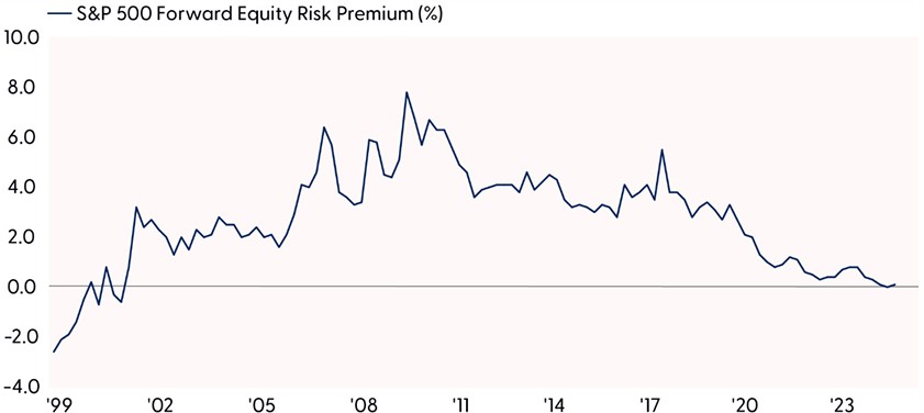 S&P 500 equity risk premium is the S&P 500 earnings yield (earnings divided by price) minus the US 10-year Treasury yield. Earnings represent estimates for the next 12 months. All indexes are unmanaged and cannot be invested into directly. Past performance is no guarantee of future results.