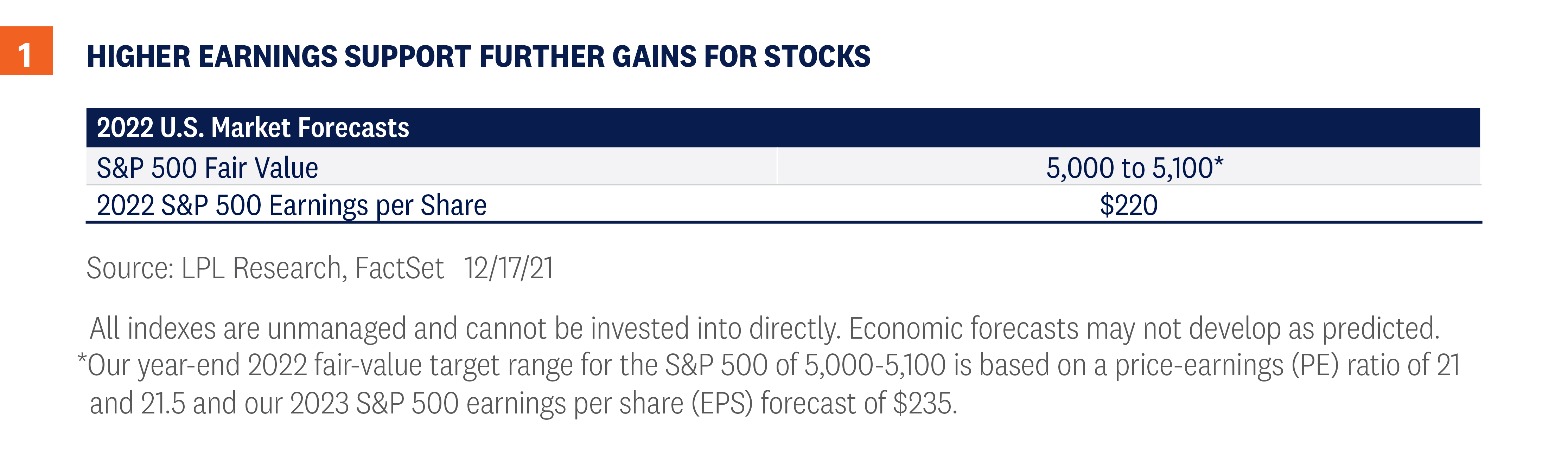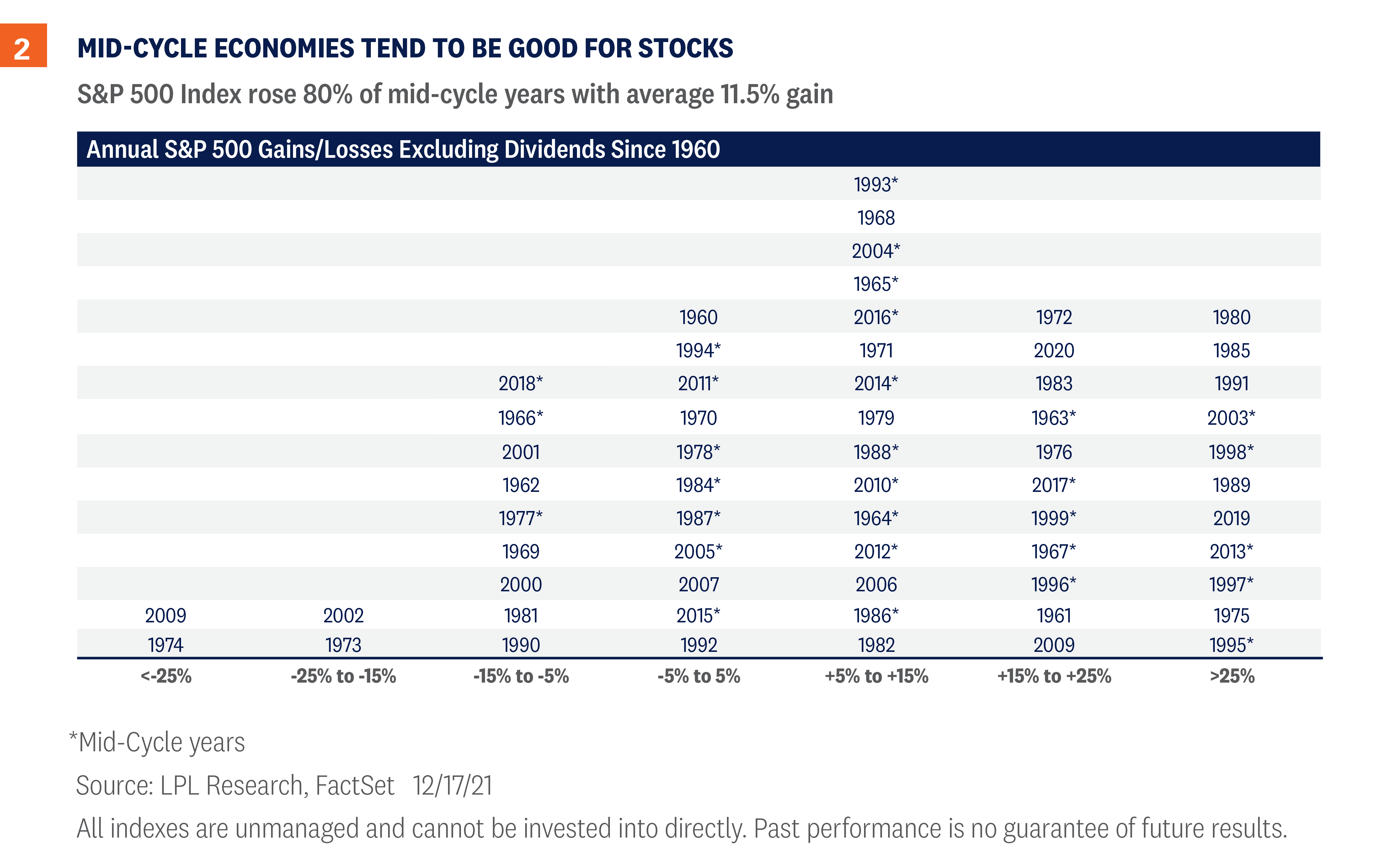 Prospects for above-average economic growth and accompanying earnings gains in 2022 point to another potentially good year for stock investors. While the pandemic is not completely behind us as the COVID-19 Omicron variant spreads rapidly (though with a high proportion of mild cases), and there are several other risks to watch, particularly inflation, stocks have historically done well in mid-cycle economies. We do not expect 2022 to be an exception.