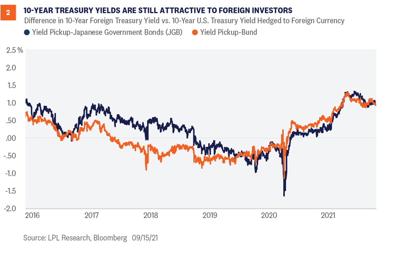 Moreover, when investing in U.S. markets, foreign investors have to be mindful of the currency risk associated with U.S. investments. Because foreign investors’ liabilities are denominated in their home currency, most foreign investors hedge out the dollar risk embedded within U.S. investments. There is a cost to hedging out that risk though, which limits the attractiveness of those cross-border investments. But as shown in Figure 2, even after considering those costs the yield pickup relative to Japanese government bonds (JGB) and/or German bunds can be substantial. Japanese and German/European investors in particular can earn an additional 1% per year by investing in U.S. Treasuries. While that may not sound like much, the alternative for many German/European investors is to pay the government 0.30% per year for 10 years for the right to own that debt. In this low-rate environment, any incremental yield pickup is welcome. As the Fed starts to raise short-term interest rates—likely in 2023—the costs to hedge the currency risk increases. But until then, the incentive for cross-border investment remains, which will likely constrain the amount of upside we will see in long-term U.S. yields through the end of 2021.