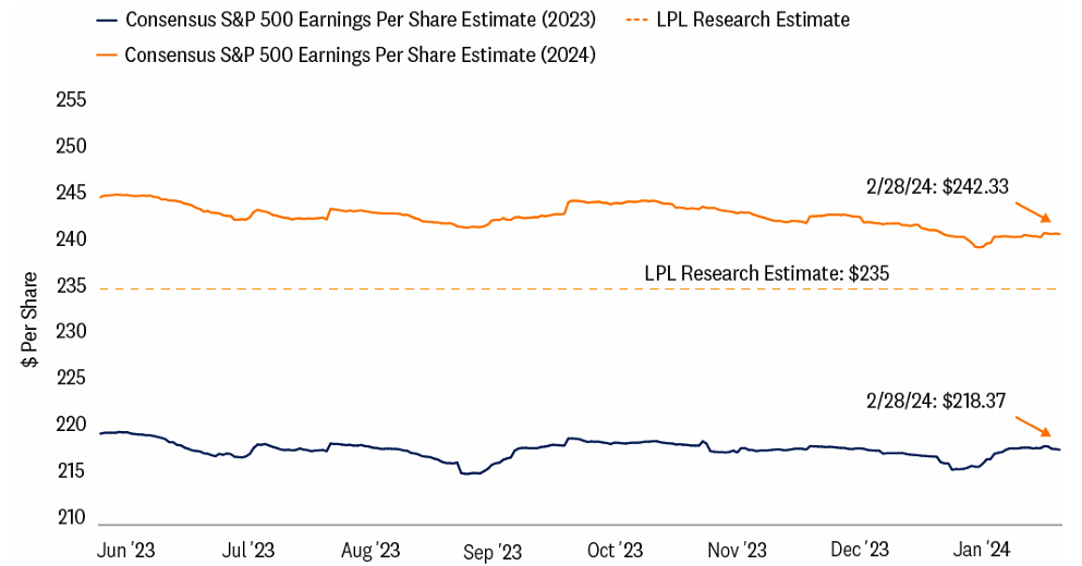 The strong earnings season and resilience of estimates increase the chances that LPL Research’s forecast for S&P 500 EPS in 2024 at $235 is too low. Also consider we increased our forecast for U.S. economic growth this year, from 1% to 1.4% (based on gross domestic product). Moreover, artificial intelligence tailwinds remain firmly in place, last year’s healthcare and natural resources earnings declines are poised to reverse, cost pressures continue to ease, and companies have maintained a fair amount of pricing power.