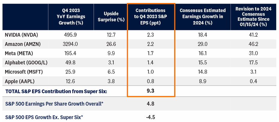 The numbers speak for themselves. Removing Tesla, which experienced a drop in earnings in the fourth quarter, the Super Six drove more than nine percentage points of earnings contribution for the S&P 500. More specifically, S&P 500 earnings per share would have declined 4.5% in the quarter if not for these six companies. Add them in and that decline becomes a 4.8% increase.