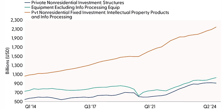 We think the strong trajectory for capital spending, especially for intellectual property and information processing equipment, will continue. Businesses are putting a larger share of their spending on research and development (R&D) as the race for improved artificial intelligence continues (“Businesses Invested Heavily in Intellectual Property” chart). Surveys suggest businesses have pent-up demand now that we are past the elections. Construction spending for healthcare, power, communication, and other structures is poised to increase, and shipments of capital goods are below current run rates, corroborating business owners’ comments about delaying, but not canceling capital expenditures (CAPEX).