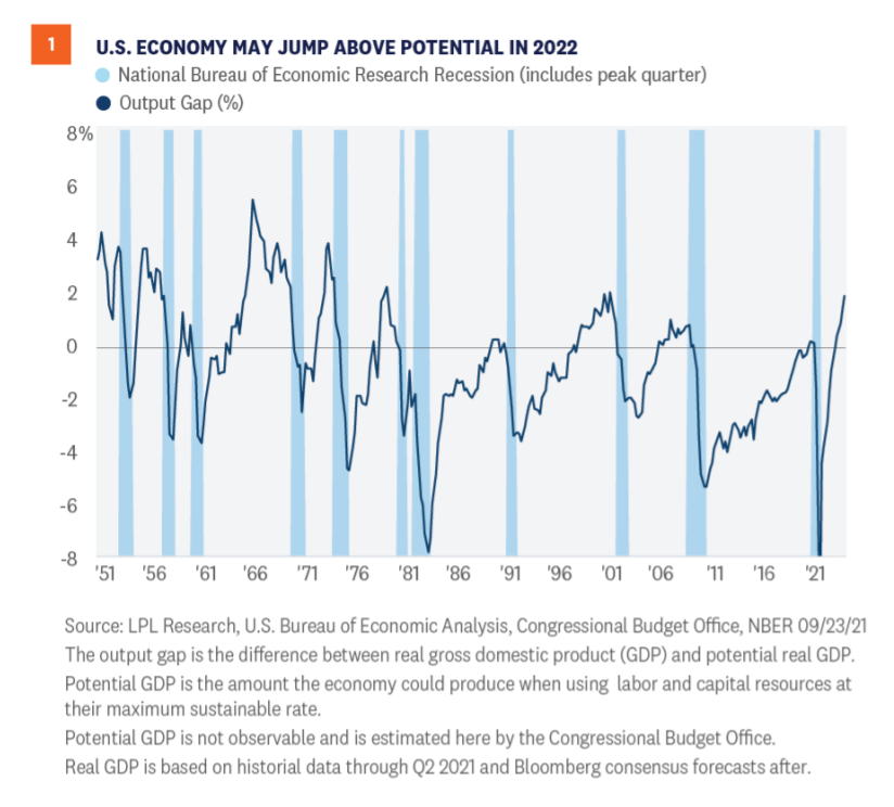 LPL Research is downgrading its 2021 U.S. GDP growth forecast from 6.25–6.75% to 5.75 6.25%. Growth is likely to come in at an annualized pace near 5% over the second half of the year. So, while expectations have been tempered, the recovery still has a lot of momentum, which is likely to extend well into 2022. In 2022 we may see economic growth exceed potential, creating a Z-shaped recovery— something we haven’t really seen since the early 1970s. What is a Z-shaped recovery and what might it mean for the Federal Reserve (Fed), inflation, and markets? We attempt to answer those questions below.