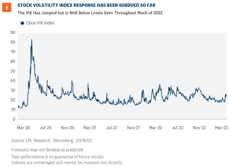 Back to domestic equity markets, the CBOE (Chicago Board Options Exchange) Volatility Index, commonly referred to as the VIX, is sometimes known as the “fear gauge”. Based on the VIX, the response to banking troubles from equity markets has been fairly subdued and certainly hasn’t indicated a wider panic is taking hold in the markets. The VIX is near 25, up around 6 points, or 30%, since the middle of last week, but this level only places it in the top 39% of readings over the last year (although the last year has been abnormally volatile and over the last 10 years the current reading would be in the top 13%) (Figure 2).
