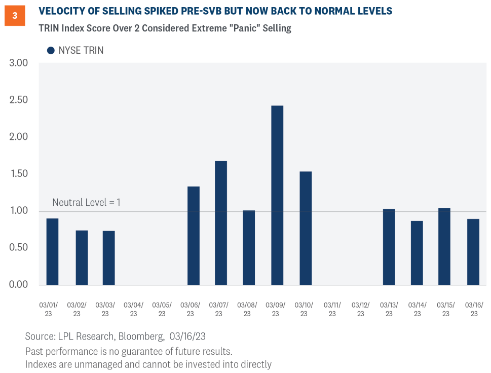 A market sentiment indicator we watch to assess stock selling pressure is the New York Stock Exchange (NYSE) Short Term Trading Index (TRIN), also known as the ARMS index. It is a technical indicator that measures the velocity of trading by looking at advancing/declining volumes and advancing/declining stocks. A TRIN score above 2 can be interpreted as a signal that the velocity of selling is at an extreme, while around 1 is considered neutral. The velocity of selling did spike on Thursday last week, indicating some panic sellers, but since then the TRIN has been at very average levels (Figure 3).